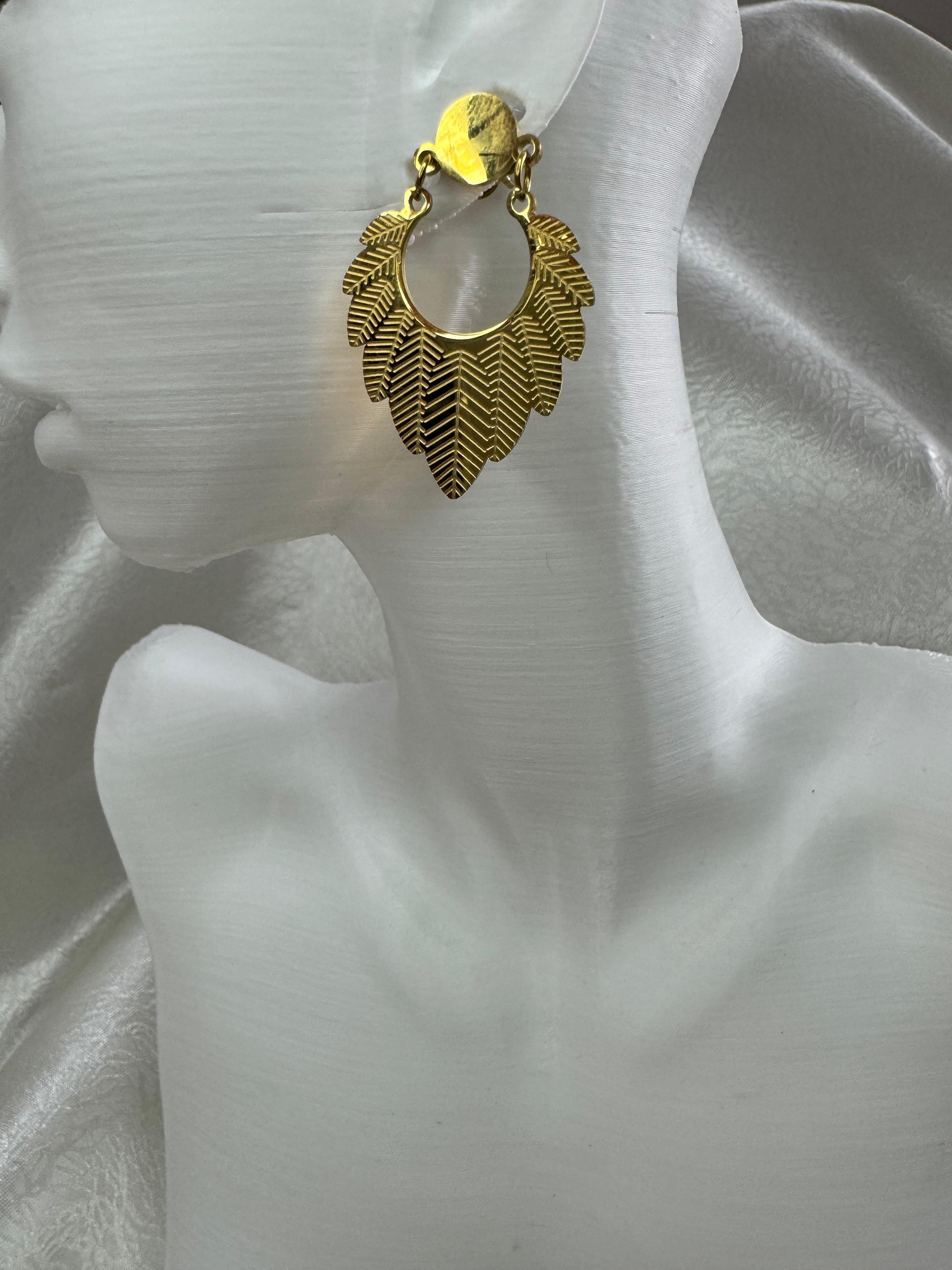 Gold renk yaprak deseni ile tasarlanan bu küpe, doğadan ilham alınarak üretilmiştir. Yaprakların zarif ve ince detayları, her biri el işçiliği ile özenle tasarlanmıştır. Bu sayede, küpenin üzerindeki her yaprak dikkatle incelendiğinde bile ciddi bir işçilik olduğu açıkça görülebilir.